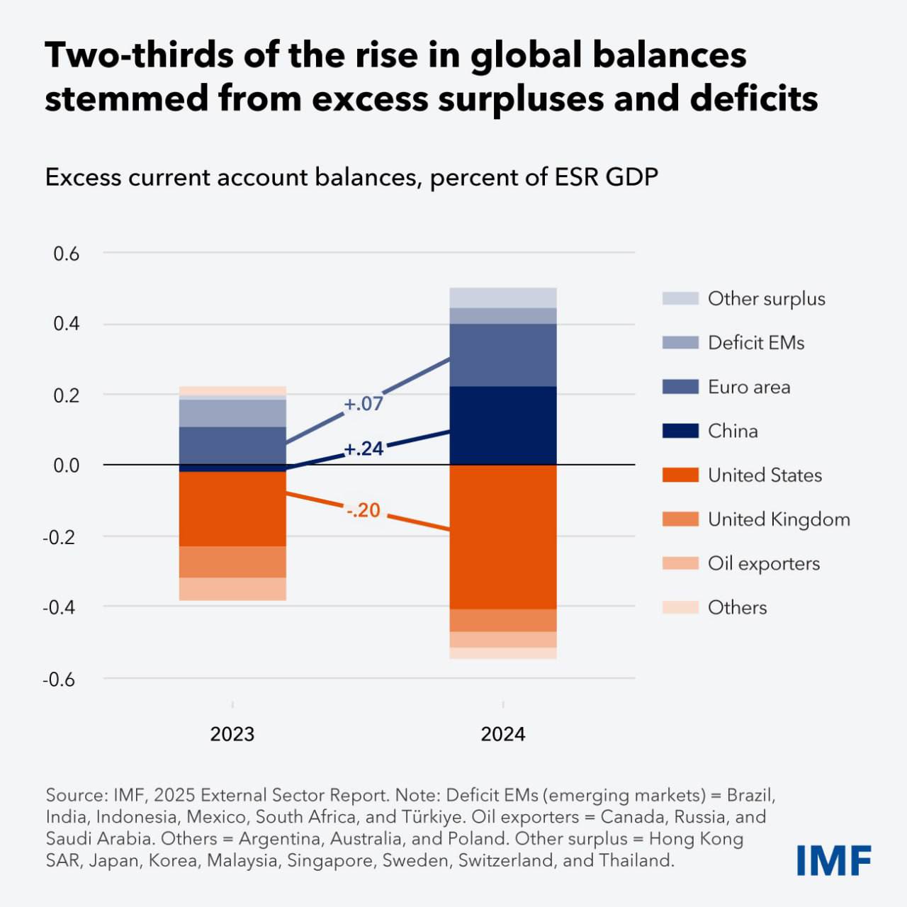 "Рост избыточного сальдо является самым значительным за десятилетие и обусловлен в первую очередь Китаем (+0,24% мирового ВВП), США (-0,20%) и, в меньшей степени, еврозоной (+0,07%)", - отмечает Гуринша.
