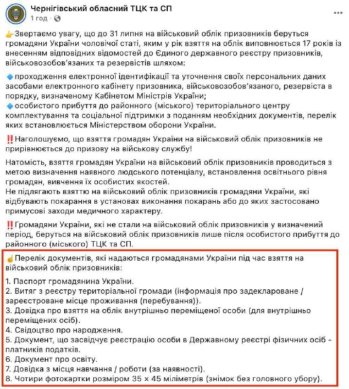 11.27 Черниговский ТЦК напоминает, что до завтрашнего дня юноши, которым в этом году исполняется 17 лет, должны стать на военный учет.