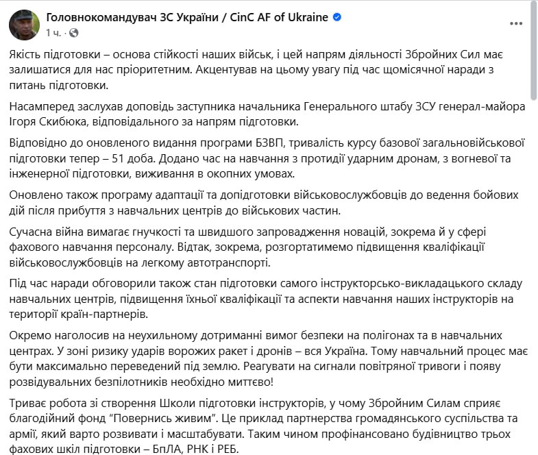 "В зоне риска ударов вражеских ракет и дронов - вся Украина. Поэтому учебный процесс должен быть максимально переведен под землю. Реагировать на сигналы воздушной тревоги и появление разведывательных беспилотников необходимо мгновенно!" - написал главком.