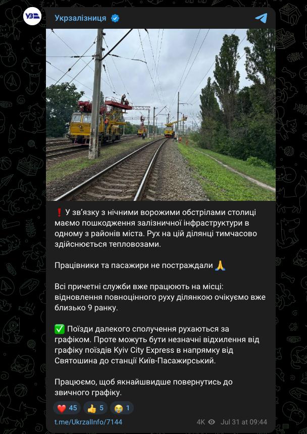 8.50 В результате ночного обстрела в Киеве повреждена железнодорожная инфраструктура в одном из районов. На этом участке временно курсируют тепловозы, сообщает "Укрзализныця".