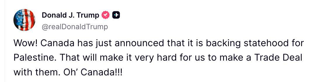 "Канада только что объявила, что поддерживает государственность Палестины. Это сильно затруднит нам заключение торгового соглашения с ними. О, Канада!" - написал Трамп.