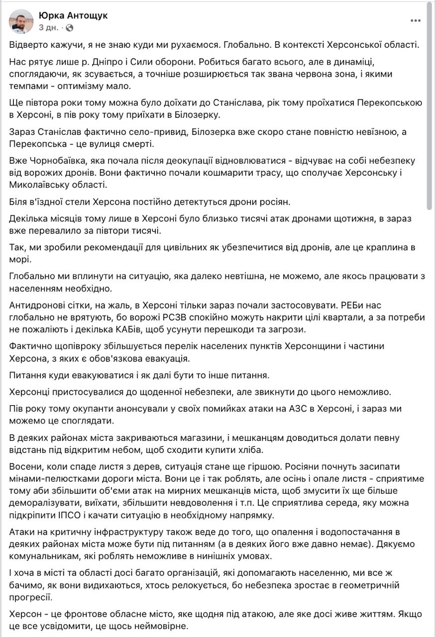 "Вопрос, куда эвакуироваться и как дальше быть, - это другой вопрос. Херсонцы приспособились к ежедневной опасности, но привыкнуть к этому невозможно. Нас спасают только река Днепр и Силы обороны. Делается много всего, но в динамике, наблюдая, как сдвигается, а точнее расширяется так называемая красная зона и какими темпами - оптимизма мало", - пишет Антощук.