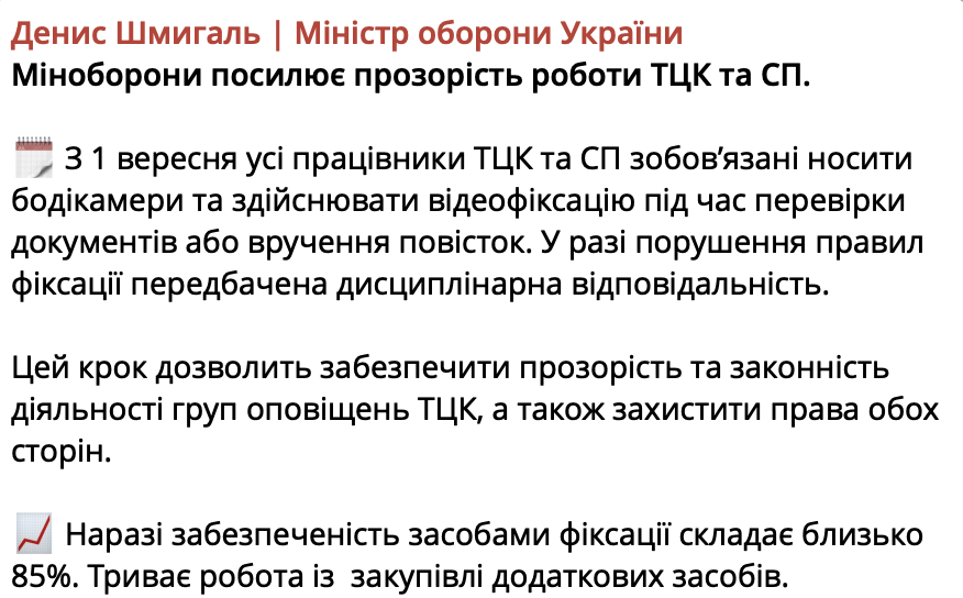 "Это позволит обеспечить прозрачность и законность деятельности групп уведомлений ТЦК, а также защитить права обеих сторон", - написал Шмыгаль.
