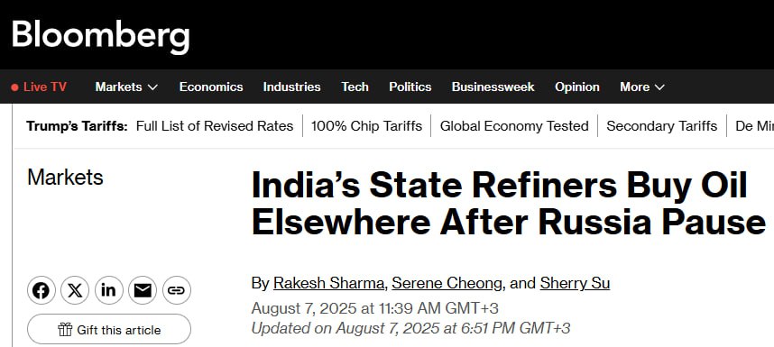 Напомним, на днях в Bloomberg уже писали, что в Индии не давали указаний нефтеперерабатывающим заводам страны отказаться от российской нефти.