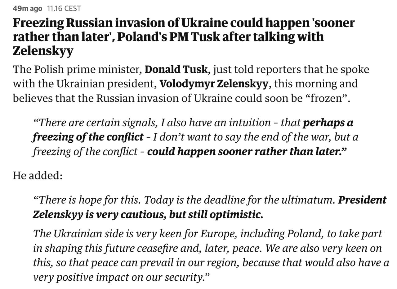13:13 Заморозка войны в Украине может произойти "скорее раньше, чем позже". Об этом заявил премьер Польши Туск после беседы с Зеленским, передает The Guardian.