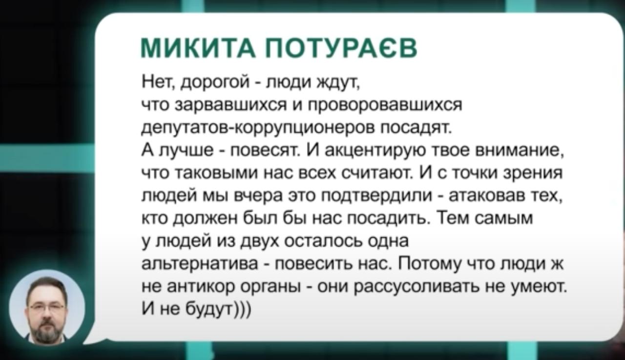 Позже Потураев также пишет, что "люди ждут, что зарвавшихся и проворовавшихся депутатов-коррупционеров посадят. А лучше - повесят. И акцентирую твое внимание, что таковыми нас всех считают".