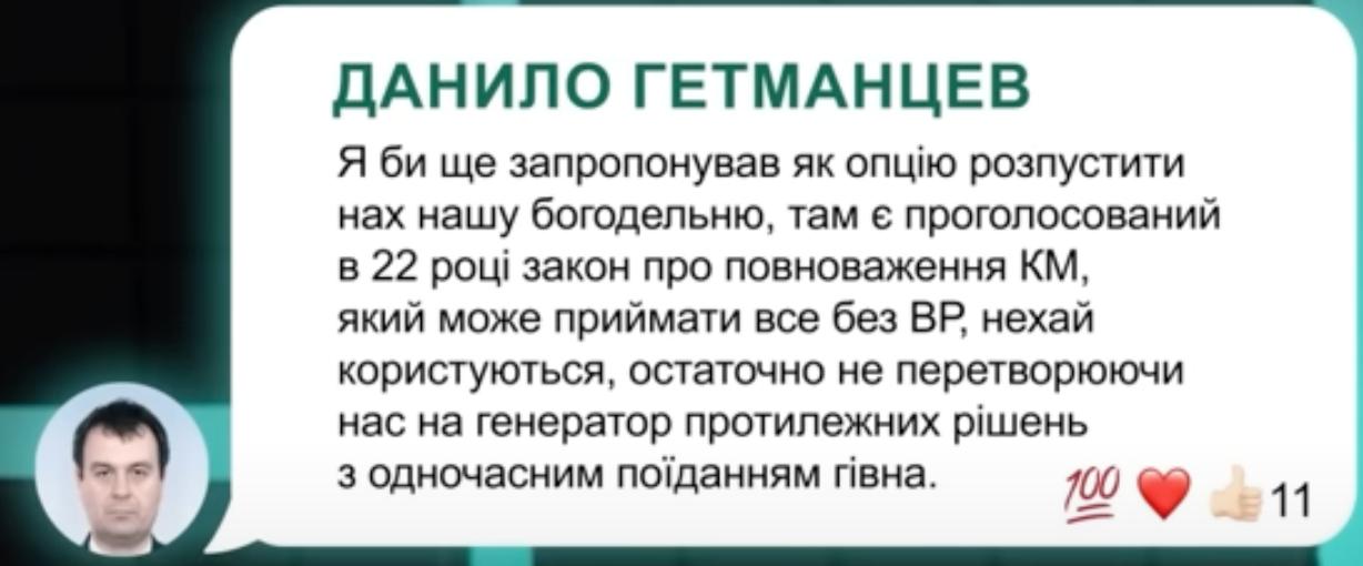 Глава налогового комитета Даниил Гетманцев предлагает вообще "распустить нах нашу богадельню", чтобы Кабмин принимал решения сам, "окончательно не превращая нас в генератор противоположных решений с одновременным поеданием г@вна". Пост собрал множество согласных смайлов.