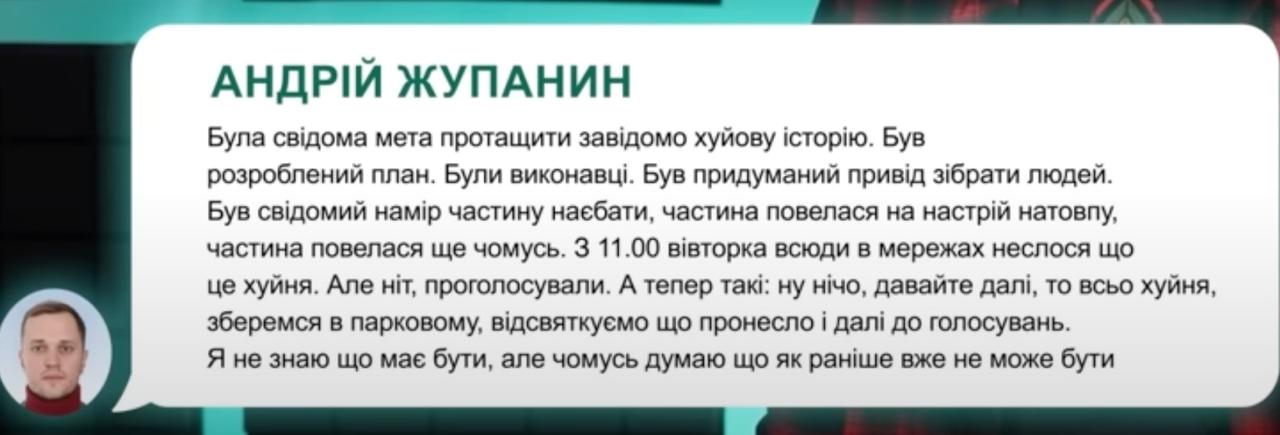 Но Дмитрий Наталуха возражает, что "это уже произошло за счет депутатов" и их по итогу объявят "предателями". Андрей Жупанин предполагает, что после этой истории "как раньше уже не будет".