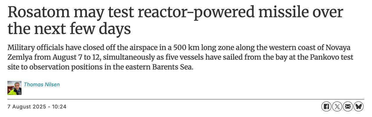 По информации издания, российские военные закрыли воздушное пространство в зоне протяженностью 500 км вдоль западного побережья архипелага с 7 по 12 августа. Кроме того, на авиабазе Рогачëво на архипелаге сейчас стоят два самолета "Росатома", которые раньше уже обслуживали подобные испытания. Наконец, у берегов Новой Земли на наблюдательных точках сейчас находятся по меньшей мере четыре судна, еще в начале недели стоявшие на якоре недалеко от испытательного полигона Паньково.