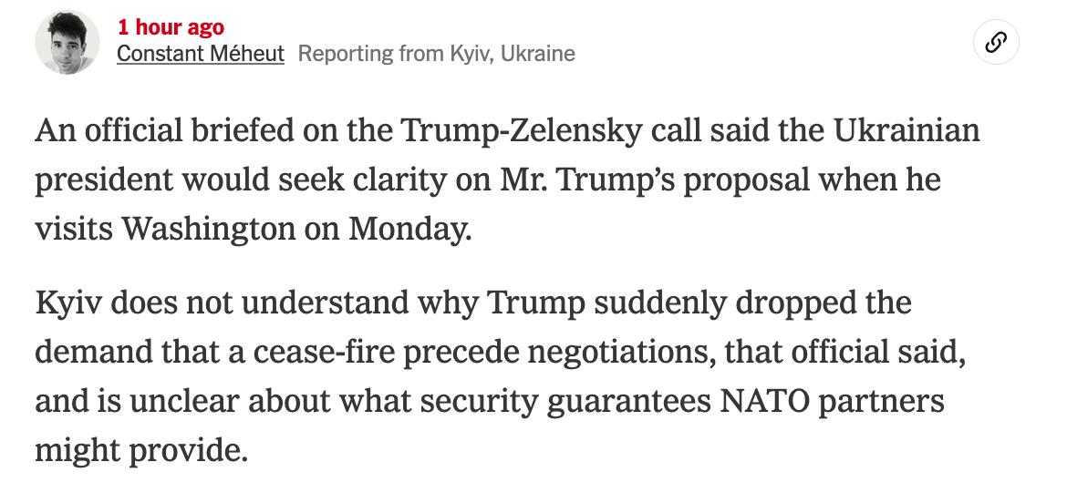 Кроме того, NYT написала, что Зеленский не понимает, почему Трамп внезапно отказался от требования к Москве прекратить огонь. Поэтому "украинский президент будет стремиться внести ясность в предложение Трампа, когда посетит Вашингтон в понедельник".