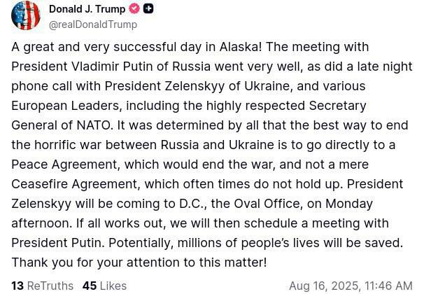 "Отличный и очень успешный день на Аляске! Встреча с президентом России Владимиром Путиным прошла очень хорошо, как и поздний ночной телефонный разговор с президентом Украины Владимиром Зеленским и различными европейскими лидерами, включая уважаемого Генерального секретаря НАТО. Все определили, что лучший способ положить конец ужасной войне между Россией и Украиной - это обратиться непосредственно к мирному соглашению, которое могло бы положить конец войне, а не к простому соглашению о прекращении огня, которое часто не соблюдается. Президент Зеленский приедет в Овальный кабинет в понедельник днем. Если все получится, мы запланируем встречу с президентом Путиным. Потенциально миллионы жизней людей будут спасены", - заявил Трамп.