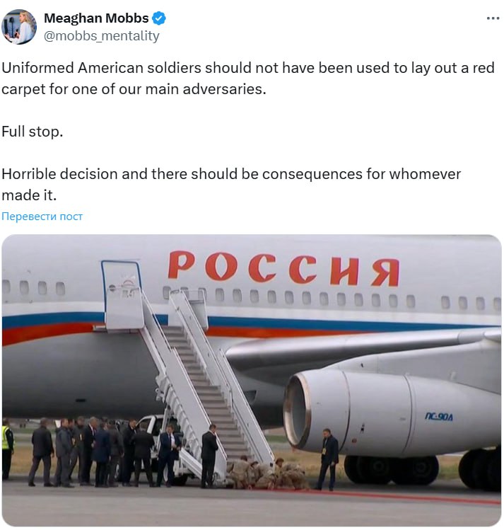 "Американских солдат в форме не следовало использовать для расстилания красной дорожки перед одним из наших главных противников. Точка. Ужасное решение, и тот, кто его принял, должен почувствовать последствия", – написала Моббс на своей странице в социальной сети Х.