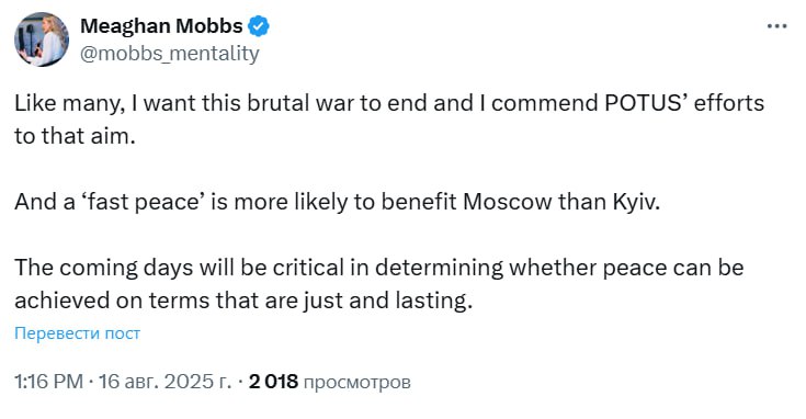 "Как и многие, я хочу, чтобы эта жестокая война закончилась, и я приветствую усилия президента США в этом направлении. И "быстрый мир" скорее принесет пользу Москве, чем Киеву. Ближайшие дни будут иметь решающее значение для определения возможности достижения мира на справедливых и прочных условиях", – говорится в более свежем посте Моббс.