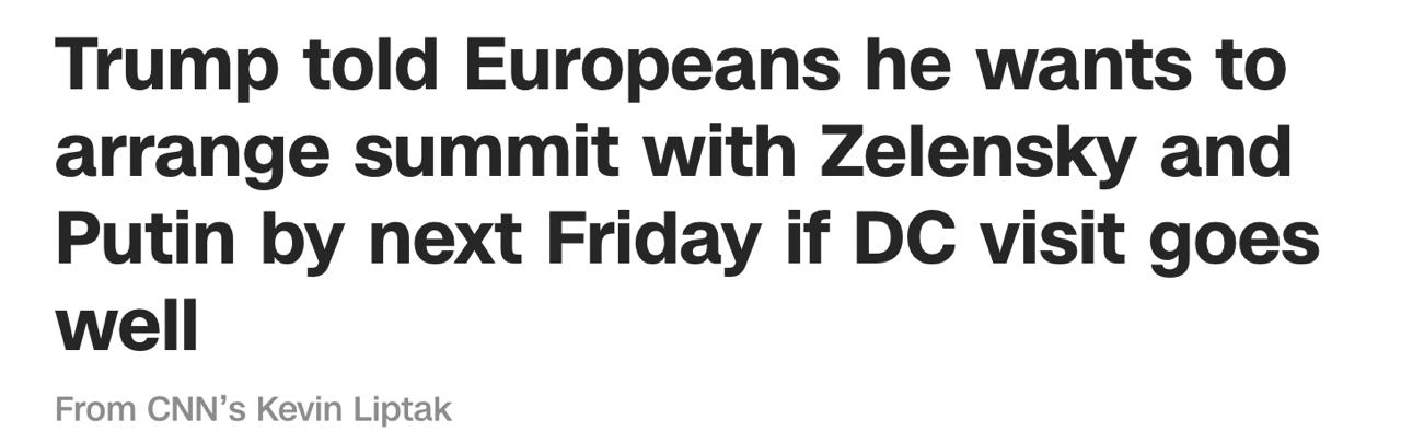 Вскоре телеканал CNN подтвердил, что Трамп хочет к 22 августа организовать встречу с Путиным и Зеленским, о чем он сказал европейским лидерам.