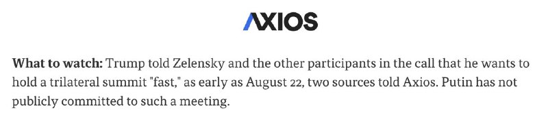 "Трамп сказал Зеленскому и другим участникам разговора (то есть европейским лидерам - Ред.), что хочет провести трехсторонний саммит "быстро" уже 22 августа", - сообщило издание со ссылкой на два источника.