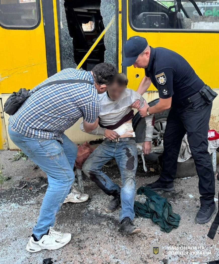 А также жилые дома и автомобили. Судя по фото, один мужчина был ранен около маршрутки.