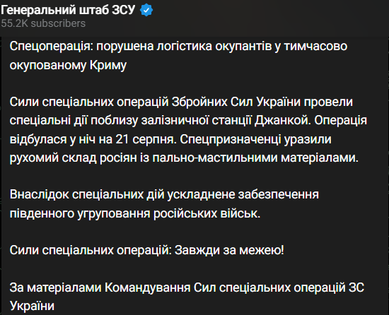 "Нарушена логистика оккупантов во временно оккупированном Крыму. Силы специальных операций Вооруженных сил Украины провели специальные действия вблизи железнодорожной станции Джанкой. Операция прошла в ночь на 21 августа. Спецназовцы поразили подвижной состав россиян с горюче-смазочными материалами", - говорится в сообщении.