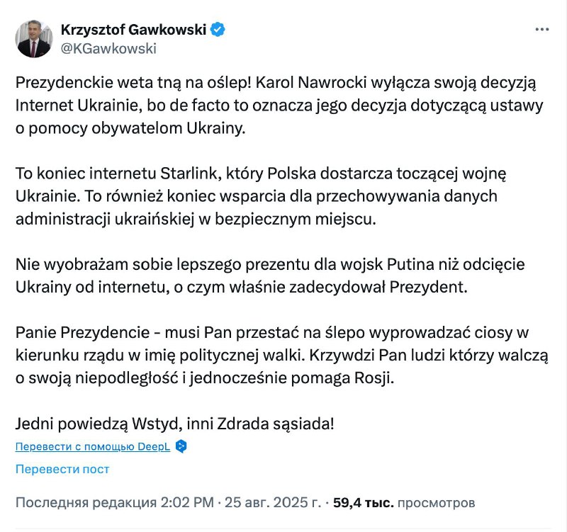 "Кароль Навроцкий своим решением отключает интернет в Украине, потому что де-факто это означает его решение относительно закона о помощи гражданам Украины. Это конец интернета Starlink, который Польша предоставляет воюющей Украине. Я не могу представить лучшего подарка для войск Путина, чем отключение Украины от интернета", - сказано в публикации Гавковского.