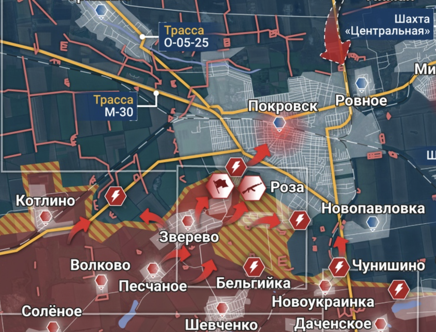 Также он заявляет, что россияне усилили наступление на Покровск со стороны террикона восточнее, пытаясь выйти к окрестностям микрорайона Лазурный. Село Троянда остается под контролем ВСУ.