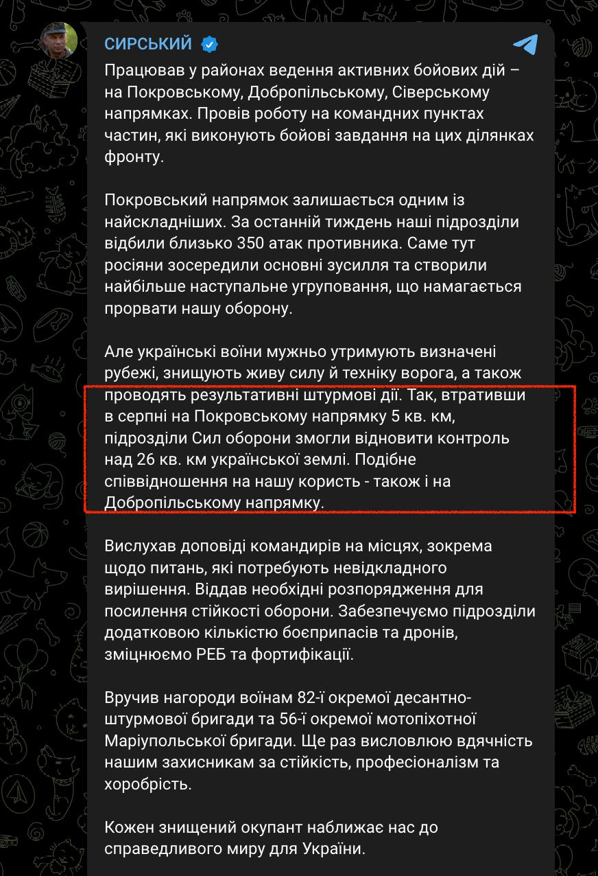 "Потеряв в августе на Покровском направлении 5 кв. км, подразделения Сил обороны смогли восстановить контроль над 26 кв. км украинской земли. Подобное соотношение в нашу пользу – также и на Добропольском направлении", - написал Сырский в своем телеграм-канале.