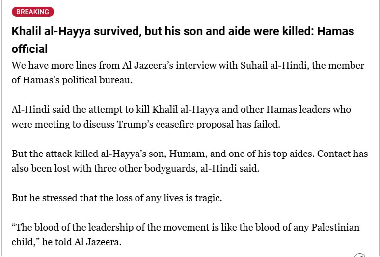 Ранее телеканал Al Jazeera со ссылкой на официального представителя движения ХАМАС сообщил, что в результате удара Израиля по Дохе погиб сын лидера ХАМАС в секторе Газа Халиля аль-Хайи.