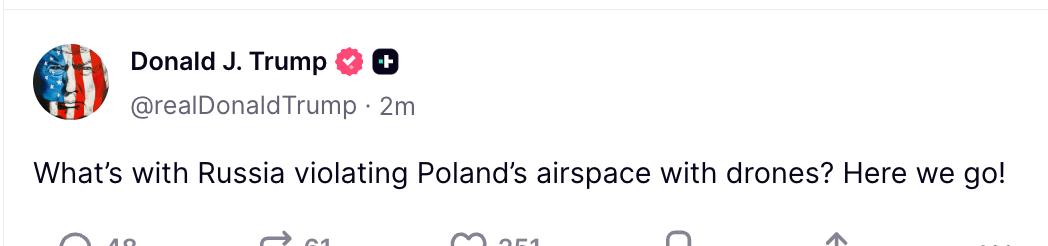 Президент США Дональд Трамп написал пост об инциденте с дронами в Польше.