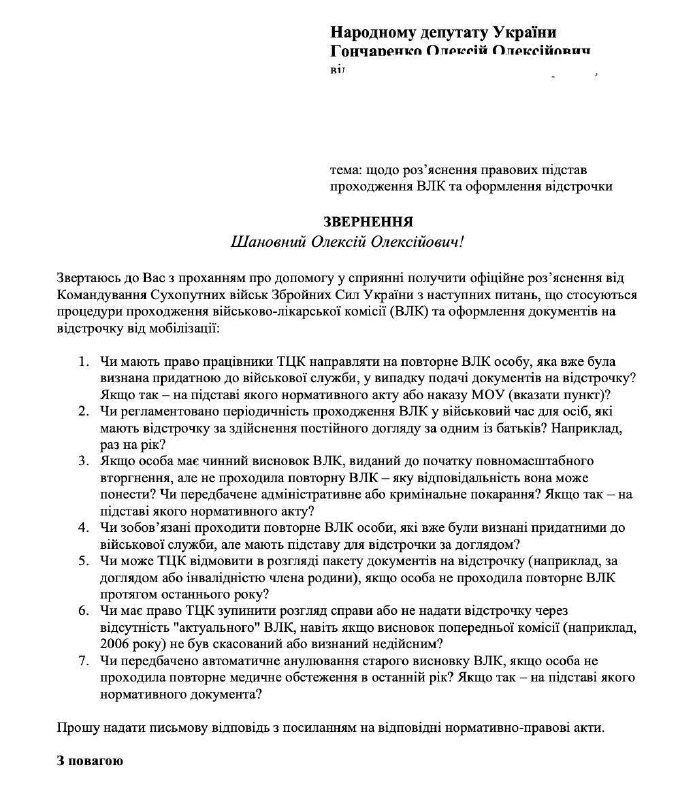 "Главное из этого ответа: если уже признали пригодным без ограничений, проходить ВВК ежегодно не нужно. Старая ВВК не аннулируется автоматически. Отказать в отсрочке из-за несвежего ВВК не имеют права. Ответственности за непрохождение ВВК раз в год законом нет. Повторно направляют на ВВК только тех, кого сочли ограниченно или временно непригодными. Вывод прост: требования ТЦК делать новый ВВК каждый год – это злоупотребление. Закон этого не требует", - пишет Гончаренко.