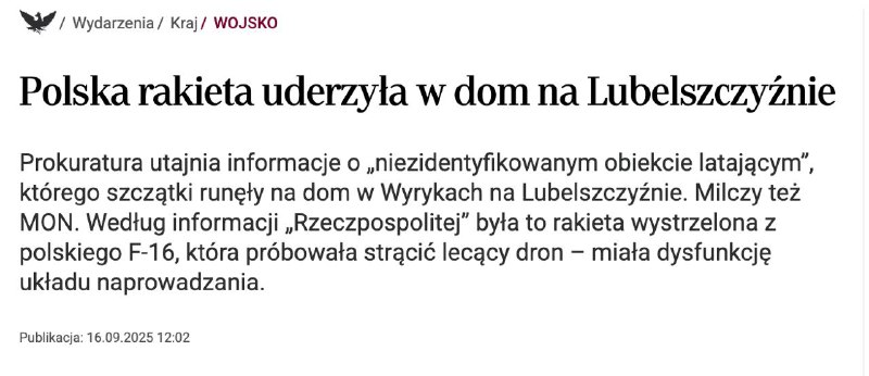 "Это была ракета, выпущенная из польского F-16, которая пыталась сбить беспилотник в полете. Его система наведения вышла из строя", – говорится в заметке.