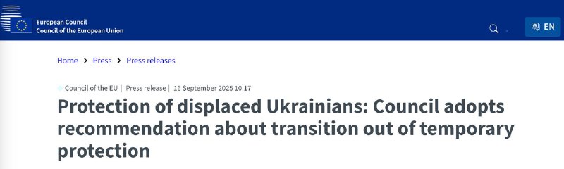 Совет Европейского союза одобрил рекомендации для государств - членов ЕС касательно возвращения, реинтеграции и изменения официального статуса украинских беженцев, когда позволят условия. План готовится на случай, когда условия в Украине позволят прекратить действие статуса временной защиты.