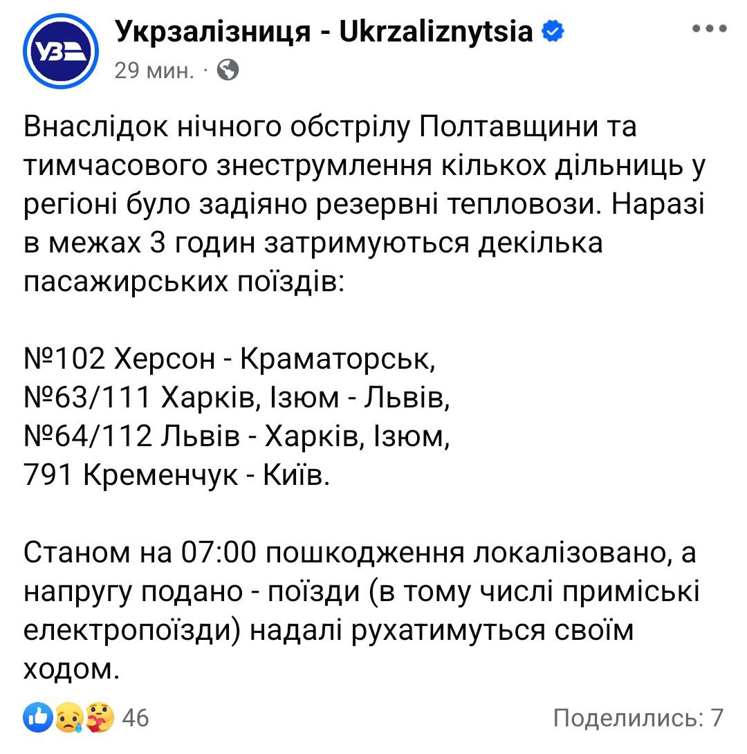 "Укрзализныця" сообщила, что из-за обстрела и обесточивания нескольких участков пришлось задействовать резервные тепловозы. В итоге несколько пассажирских поездов задержались до трёх часов: