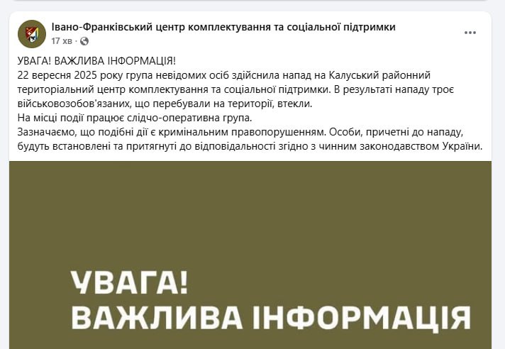 В городе Калуш Ивано-Франковской области группа неизвестных совершила атаку на районный территориальный центр комплектования и социальной поддержки (ТЦК и СП) и освободила троих задержанных.