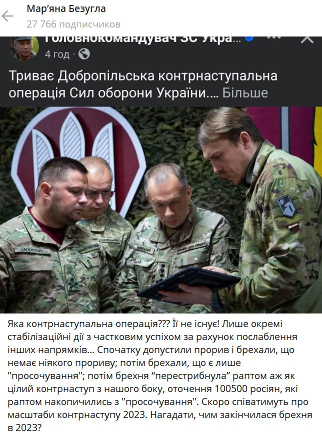 "Какая контрнаступательная операция??? Ее не существует! Лишь отдельные стабилизационные действия с частичным успехом за счет ослабления других направлений... Сначала допустили прорыв и врали, что нет никакого прорыва; потом врали, что есть только "просачивание"; затем ложь "перепрыгнула" вдруг как целое контрнаступление с нашей стороны, окружение 100500 россиян, которые вдруг накопились из "просачивания". Скоро будут петь о масштабах контрнаступления 2023 года. Напомнить, чем закончилась ложь в 2023 году?" – прокомментировала Безуглая заявление Сырского.