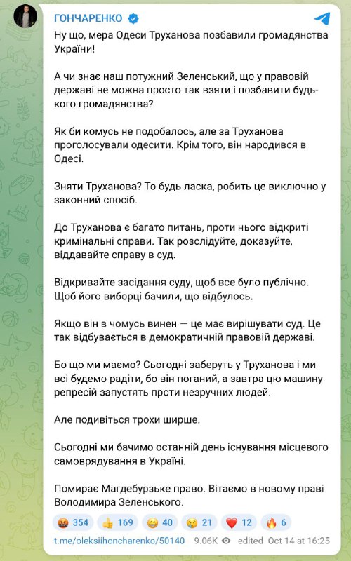 "В правовом государстве нельзя просто так взять и лишить кого-либо гражданства. Как бы кому-то ни нравилось, но за Труханова проголосовали одесситы. Кроме того, он родился в Одессе. Если уж и снимать Труханова, то это нужно делать исключительно законным способом. К Труханову много вопросов, против него возбуждены уголовные дела. Так расследуйте, доказывайте, отдавайте дело в суд. Сегодня заберут у Труханова и мы все будем радоваться, потому что он плохой, а завтра машину репрессий запустят против неудобных людей", - пишет Гончаренко в Телеграме.