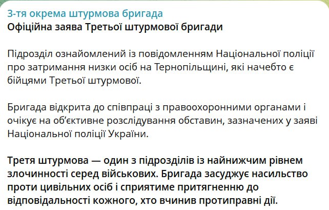Позже 3-я штурмовая бригада не стала отрицать, что это ее бойцы задержаны полицией в Тернопольской области за похищение гражданских и насилие над ними.