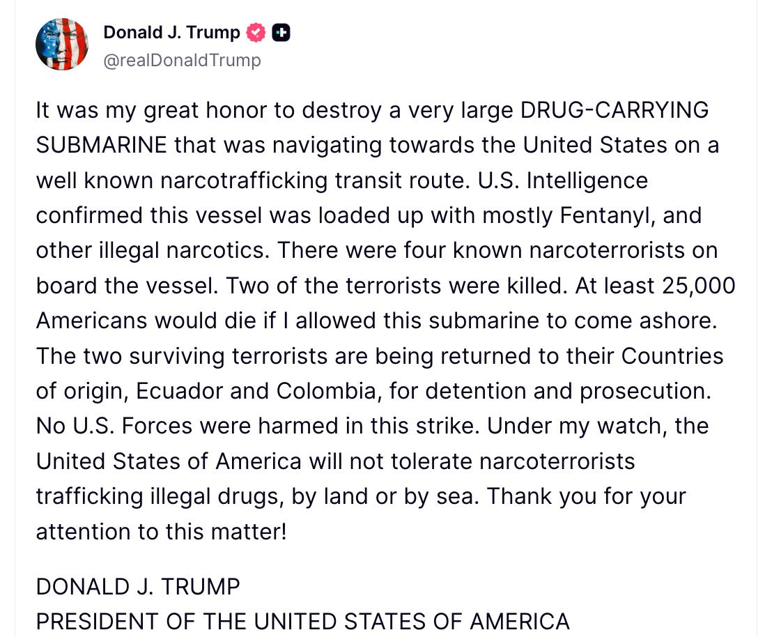 "По данным разведки, субмарина была загружена фентанилом и другими наркотиками. Если бы я позволил ей достичь берега, погибли бы не менее 25 тысяч американцев", - написал Трамп.