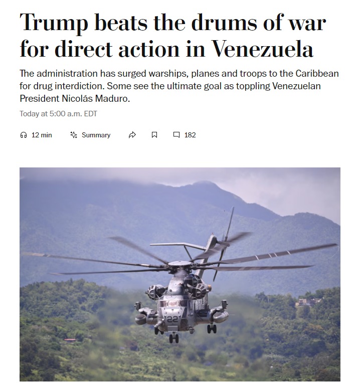 The Washington Post напомнила, что в Карибское море переброшены десятки военных кораблей и самолётов США, а также тысячи американских военнослужащих в рамках объявленного Трампом "вооружённого конфликта" с наркокартелями, которые он назвал международными террористами. В результате авиаударов США было уничтожено по меньшей мере семь судов, которые, по словам Трампа, перевозили из Венесуэлы наркотики в Соединённые Штаты в международных водах, в результате чего погибли десятки предполагаемых наркоторговцев.