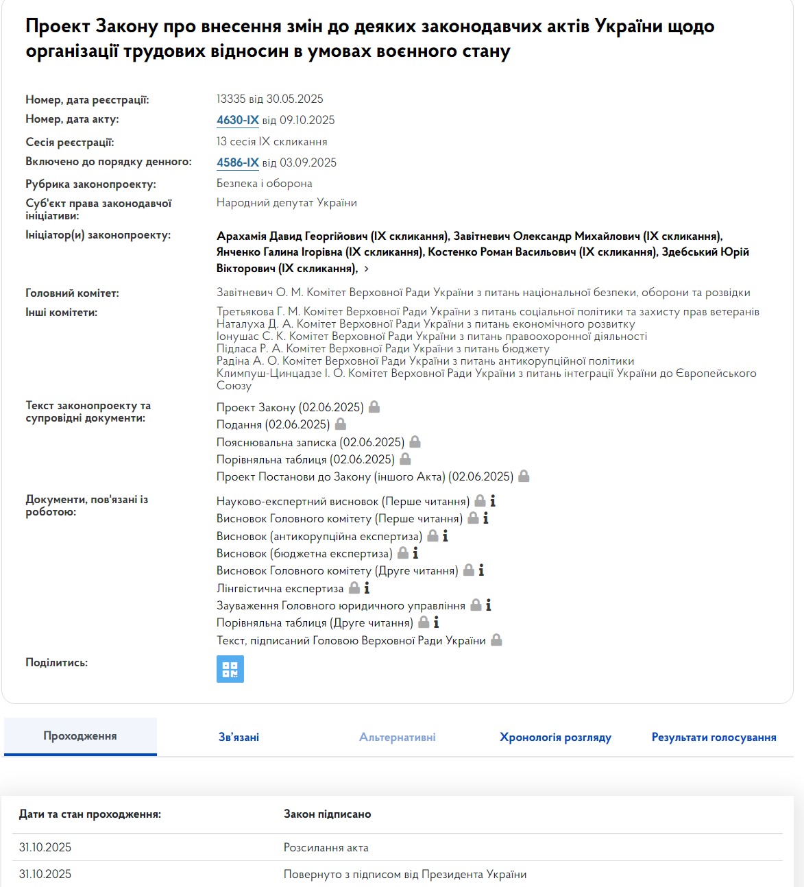 Об этом свидетельствует карточка документа на сайте Верховной Рады. Президент завизировал закон еще 31 октября.