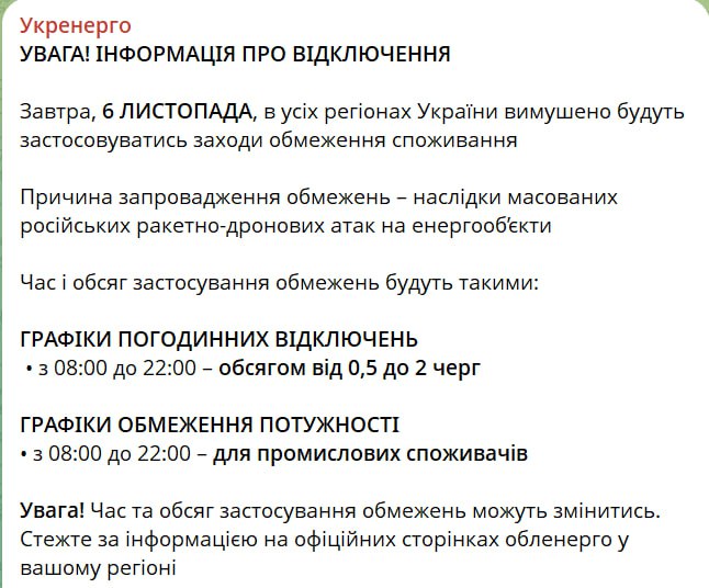 19.06 Отключения света завтра будут по всей стране с 08:00 до 22:00 – объемом от 0,5 до 2 очередей, сообщает "Укрэнерго".