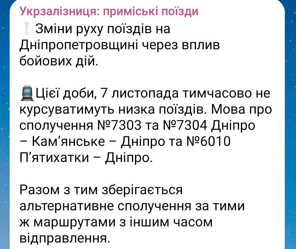 08:03 Из-за боевых действий "Укрзализныця" изменила движение поездов на Днепропетровщине. 7 ноября временно не будут курсировать поезда №7303 и №7304 Днепр – Каменское – Днепр и №6010 Пятихатки – Днепр.