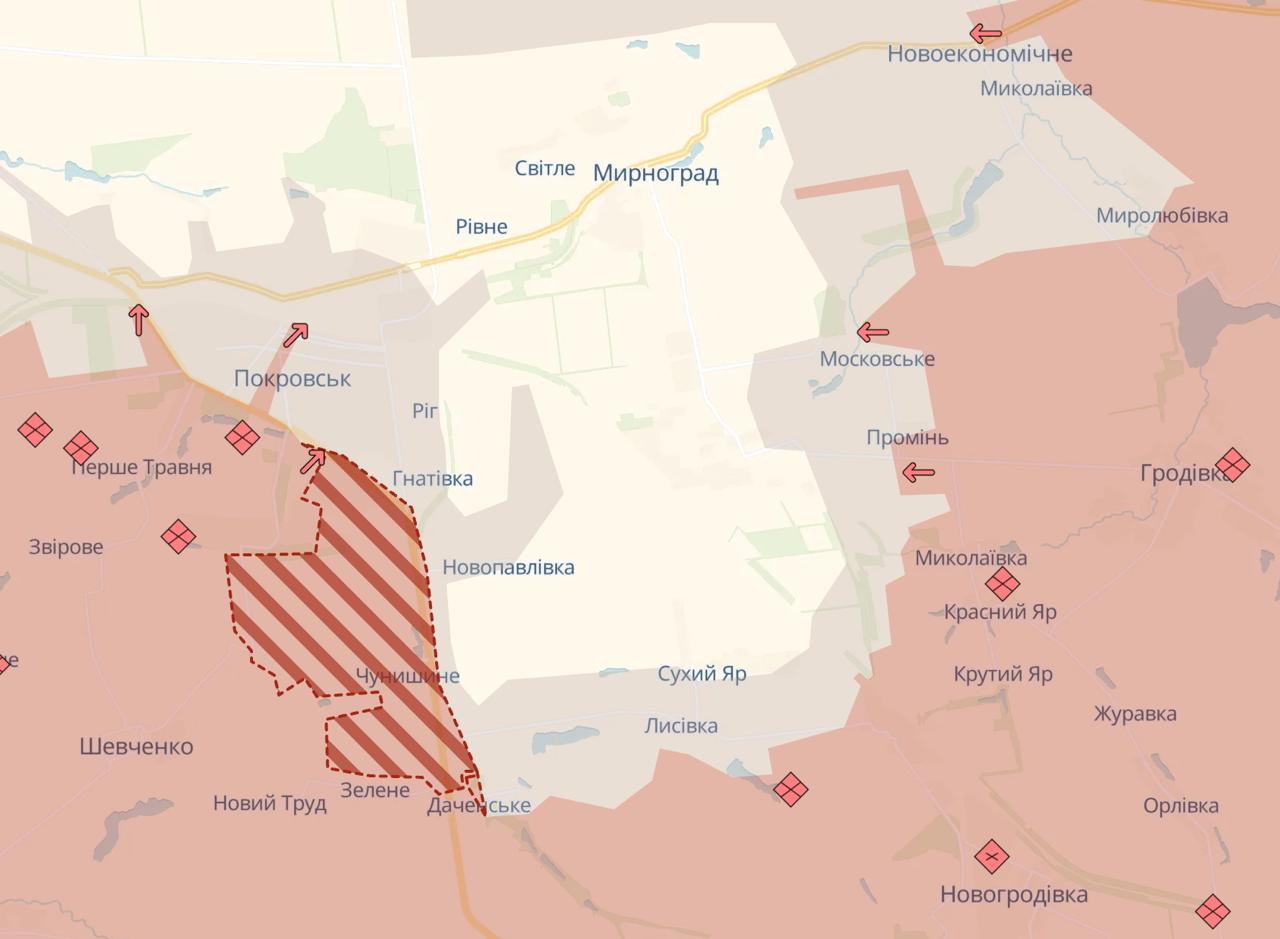 Также россияне продвинулись под Покровском - они масштабно закрепили свои позиции к югу от города. Ранее украинские военные сообщали, что войска РФ заходят в город преимущественно через южные кварталы.