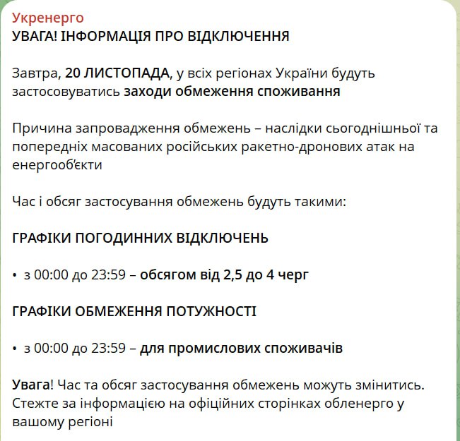 18.08 Отключения света завтра будут во всех регионах – круглосуточно в объеме от 2,5 до 4 очередей, сообщает "Укрэнерго".