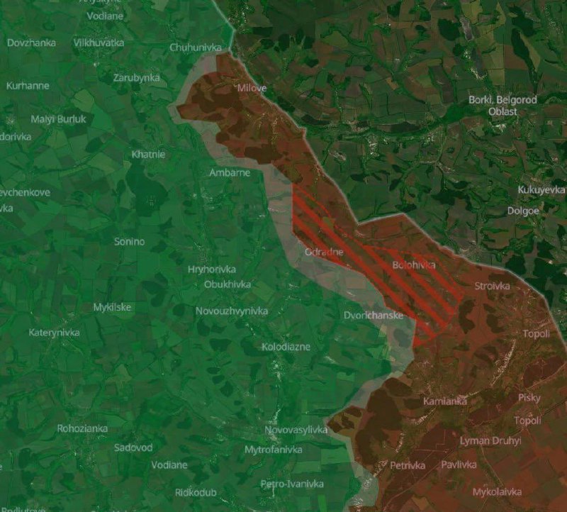 По данным сайта, российские войска захватили Отрадное и Бологовку в Харьковской области на границе с Россией, и продвинулись у Двуречанского на этом же участке.