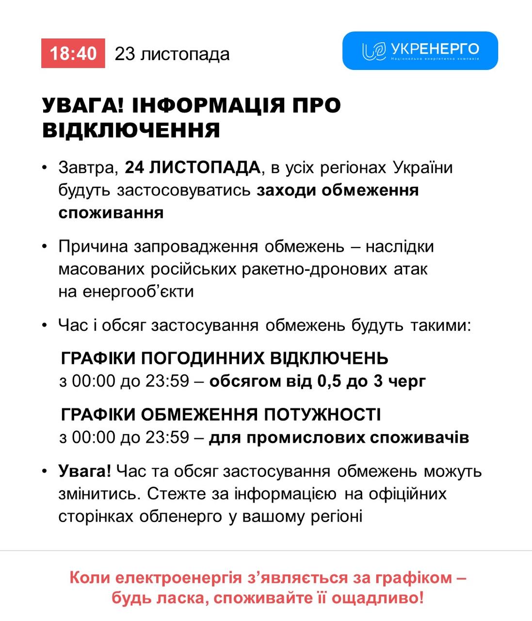 19:02 Завтра во всех регионах Украины круглые сутки будут идти отключения света.