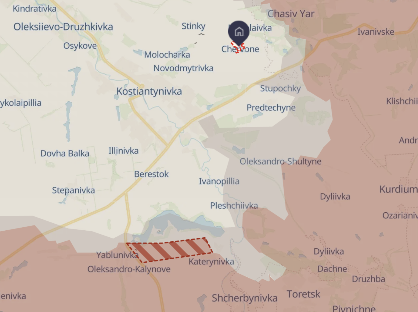 Российское минобороны заявило сегодня о захвате села Червоное к северо-востоку от Константиновки. Украина этого не подтверждала. В перспективе это может выгдядеть как попытка россиян войти в город и на этом направлении (сейчас они вошли в Констаниновку с юго-востока).