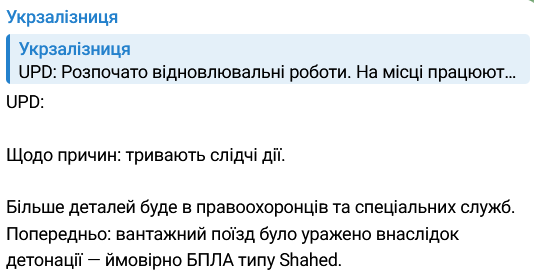 В то же время и украинские телеграм-каналы предполагают, что по грузовому составу ударил "Шахед". Ранее сообщалось о воздушной тревоге в Коростене, близ которого случился инцидент.