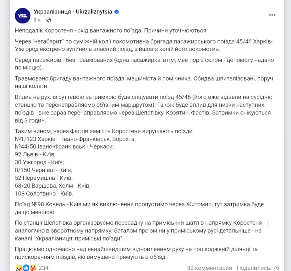 Ночью в Житомирской области сошли с рельсов грузовой состав, а также локомотив пассажирского поезда Харьков–Ужгород.