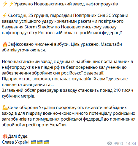 "Новошахтинский завод является одним из крупнейших поставщиков нефтепродуктов на юге РФ и напрямую участвует в обеспечении вооружённых сил РФ. Предприятие, в частности, поставляет оккупационной армии дизельное топливо и авиационный керосин. Общий объём резервуаров завода составляет более 210 тысяч кубических метров", - говорится в сообщении.