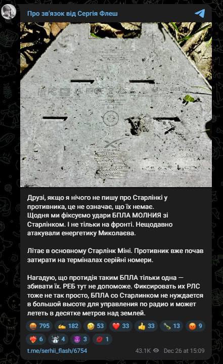 "Летает в основном Старлинк Мини. Противник уже начал затирать на терминалах серийные номера. Напоминаю, что противодействие таким БПЛА только одно – сбивать их. РЭБ здесь не поможет. Фиксировать их РЛС тоже не так просто, БПЛА со Старлинком не нуждается в большой высоте и может лететь в десятке метров над землей", - пишет "Флеш".