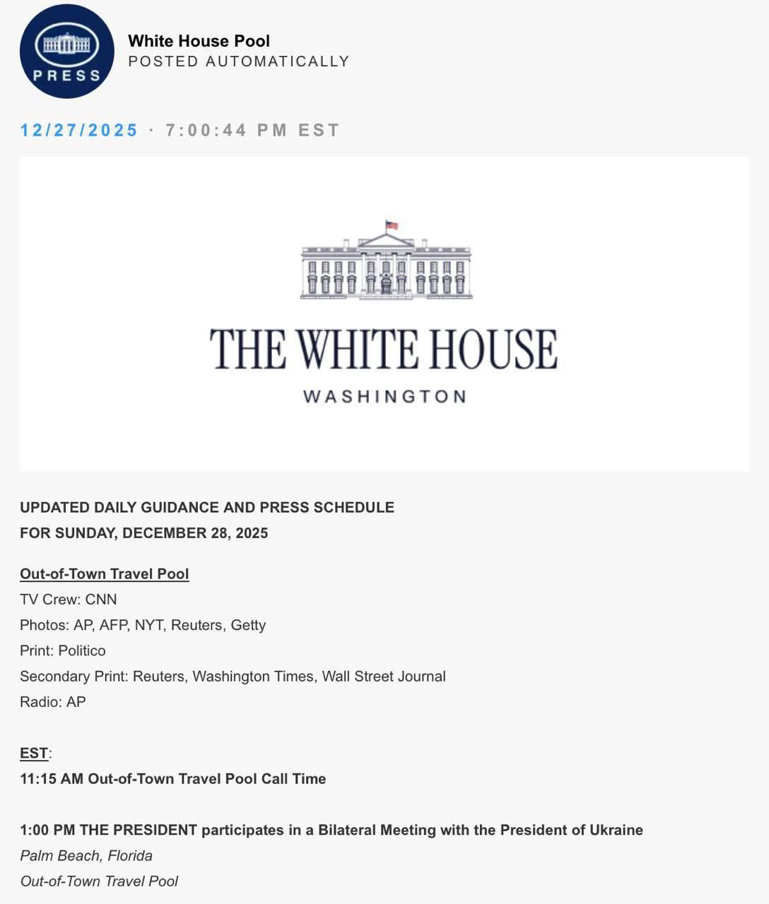 Об этом сообщает пресс-пул Белого дома.
