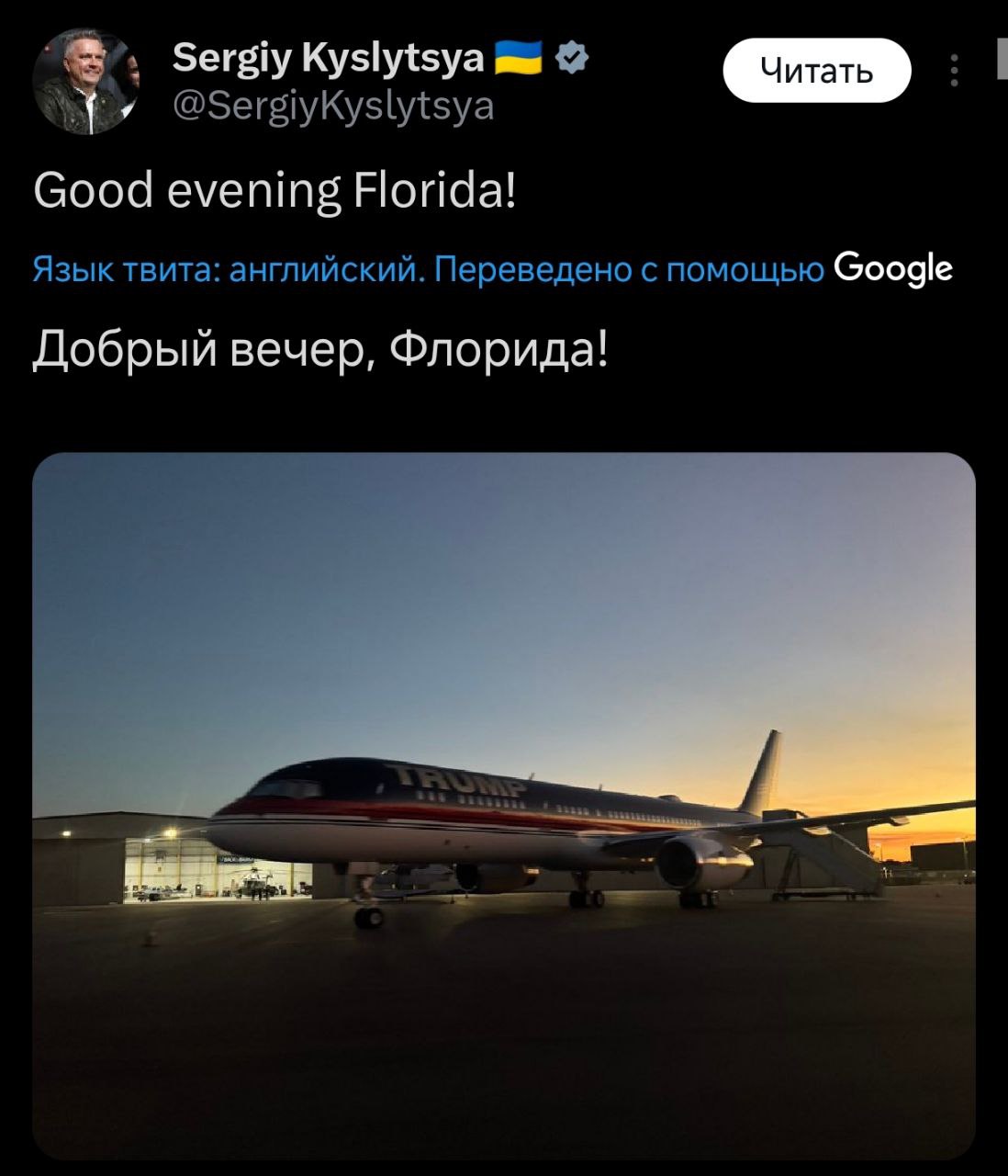 Член украинской делегации Сергей Кислица в свою очередь разместил на своей странице в Facebook фотографию с самолетом, подписав ее "Добрый вечер, Флорида!".